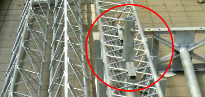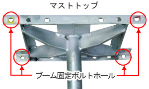 ![]() マストトップの片側のボルトを外してブームを倒して作業ができます。(それぞれ左右にあります) |